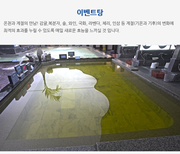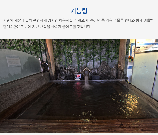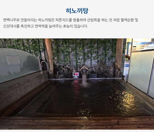 온탕, 열탕, 이벤트탕, 히노끼탕, 기능탕, 파도냉탕, 적외선침대, 습식사우나, 건식사우나,